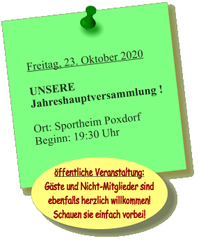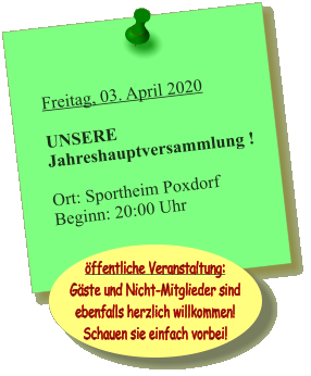 Samstag, 07 März 2020   Obstbaumschnittkurs(öffentliche Veranstaltung, auch Nicht-Mitglieder sind herzlich willkommen - Anmeldung nicht erforderlich)  Treffpunkt: Dorfbrunnen Poxdorf(Ortseingang aus Richtung Baiersdorf/Hagenau, gegenüber Reiterhof)  Kurs-Ort: Freifeld in bequemer Fussreichweite vom Treffpunkt  Beginn: 09:30 Uhr (Dauer 2-3 Stunden)  Unkosten Mitglieder: frei Unkosten Nicht-Mitglieder: 5€ Sonntag, 22. März 2020   Kindermusical "Willi Wühlmaus am Nordpol"   Ort: Schulturnhalle Poxdorf  Beginn: 16:00 Uhr ABSAGE aufgrund der aktuellen Corona-Einschränkungen. Rückerstattung der Eintrittskartenkosten Unser Verein wünscht allen Mitgliedern, Freunden und Besuchern unserer Seiten für die momentane Zeit trotz mancher Einschränkung auch viele positive Erfahrungen und noch mehr Gesundheit! Verschiebung aufgrund der aktuellen Corona-Einschränkungen.  Neuer Termin wird bekannt gegeben