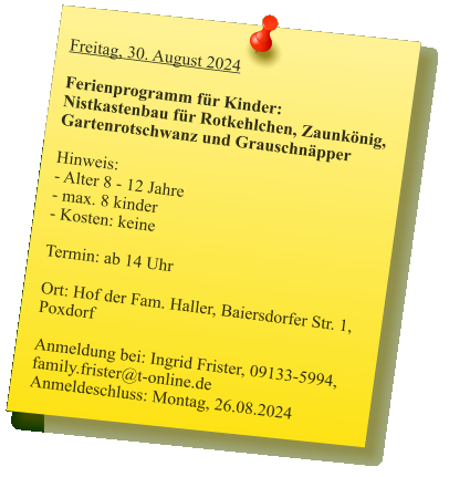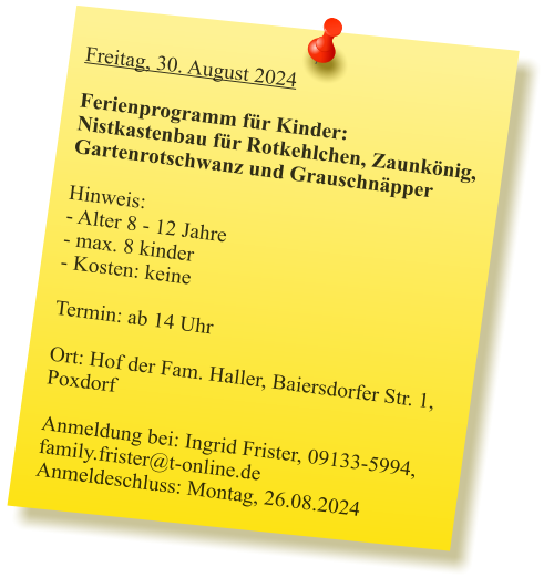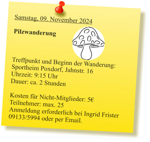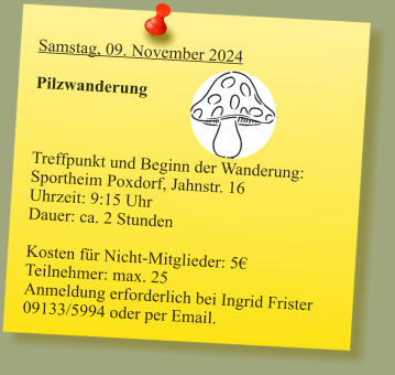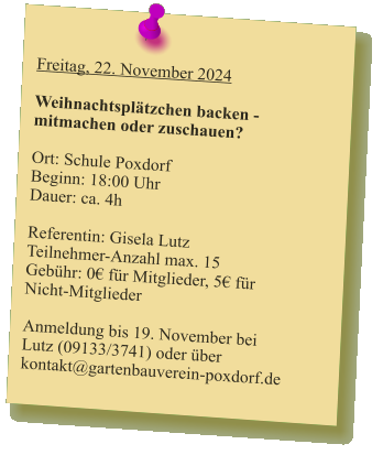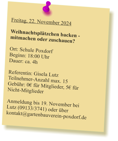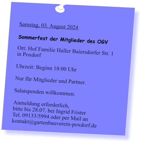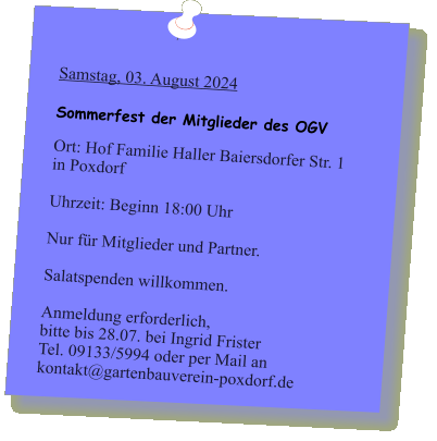2024-05_Mai.pdf Sonntag, 30. Juni 2024  Tag der offenen Gartentür 2024  Wir weisen auf eine Veranstaltung des Kreisverbandes hin: 5 Gärten im Landkreis Forchheim  (Effeltrich, Hausen, Forchheim, Morschreuth und Etlaswind) können besichtigt werden   Uhrzeit: 11:00 - 17:00 Uhr  Details und pdf-Broschüre hier auf der Seite des Kreisverbandes… 2024-06_Juni.pdf 2024-07_Juli.pdf 2024-08_August.pdf Samstag, 28. September 2024  Vereinsausflug nach Cadolzburg     Anmeldung erforderlich, siehe Termine 2024-09_September.pdf Der praktische Gartenkalender 2025 jetzt erhältlich!  Der Obst- und Gartenbauverein Poxdorf bietet für Mitglieder und Interessierte die Möglichkeit, den praktischen Gartenkalender für das Jahr 2025 vorzubestellen, zu einem Preis von 5,50 Euro. Der Kalender führt durch das ganze Gartenjahr, wieder gut gefüllt mit Schönem, Informativem und Nützlichem. Das Kalendarium enthält Namenstage, Ferientermine in Bayern, die Zeiten von Sonnenauf- und Sonnenuntergang, die Mondphasen und den 100-jährigen Kalender. Außerdem erfahren Sie, dass „Superfood“ aus Ihrem eigenen Garten kommen kann! Interessierte können sich telefonisch bei Ingrid Frister unter 09133/5994 melden, oder senden Sie eine E-Mail an: kontakt@gartenbauverein-poxdorf.de. Die Anmeldefrist endet am 30. November 2024. 2024-11_November_2024.neu.pdf