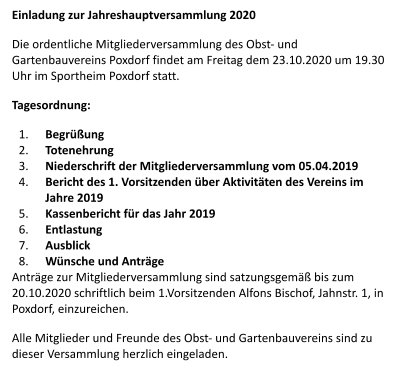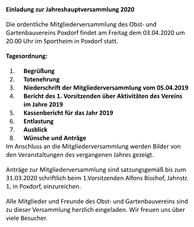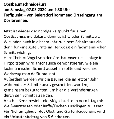Samstag, 07 März 2020   Obstbaumschnittkurs(öffentliche Veranstaltung, auch Nicht-Mitglieder sind herzlich willkommen - Anmeldung nicht erforderlich)  Treffpunkt: Dorfbrunnen Poxdorf(Ortseingang aus Richtung Baiersdorf/Hagenau, gegenüber Reiterhof)  Kurs-Ort: Freifeld in bequemer Fussreichweite vom Treffpunkt  Beginn: 09:30 Uhr (Dauer 2-3 Stunden)  Unkosten Mitglieder: frei Unkosten Nicht-Mitglieder: 5€ Sonntag, 22. März 2020   Kindermusical "Willi Wühlmaus am Nordpol"   Ort: Schulturnhalle Poxdorf  Beginn: 16:00 Uhr ABSAGE aufgrund der aktuellen Corona-Einschränkungen. Rückerstattung der Eintrittskartenkosten Unser Verein wünscht allen Mitgliedern, Freunden und Besuchern unserer Seiten für die momentane Zeit trotz mancher Einschränkung auch viele positive Erfahrungen und noch mehr Gesundheit! Verschiebung aufgrund der aktuellen Corona-Einschränkungen.  Neuer Termin wird bekannt gegeben