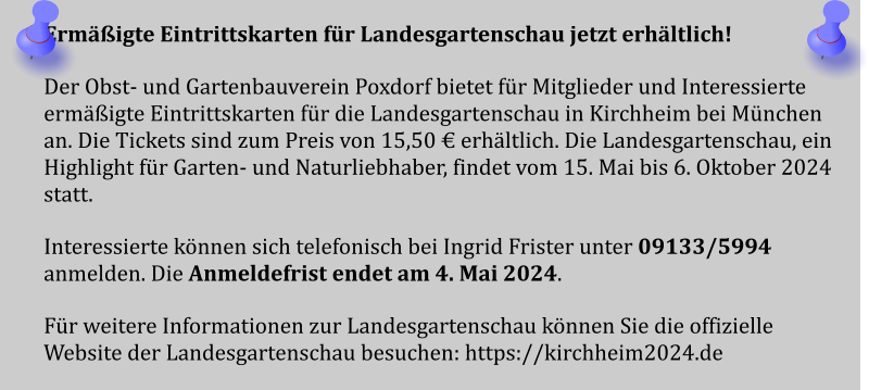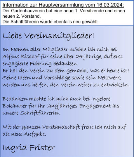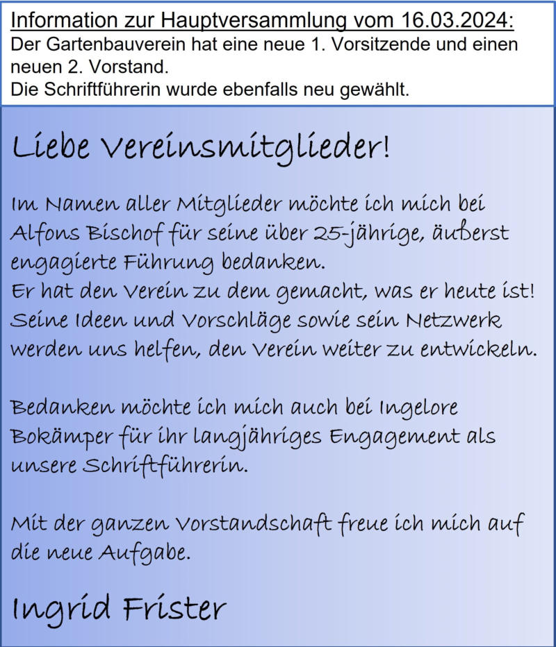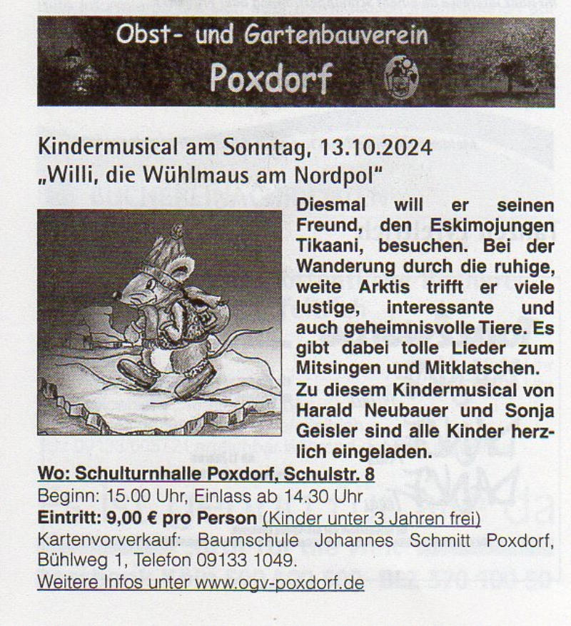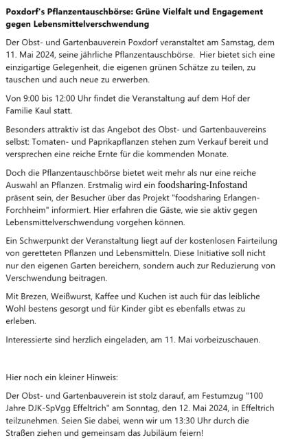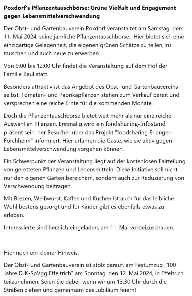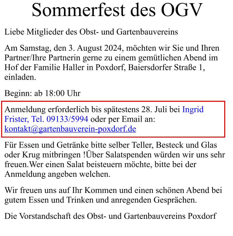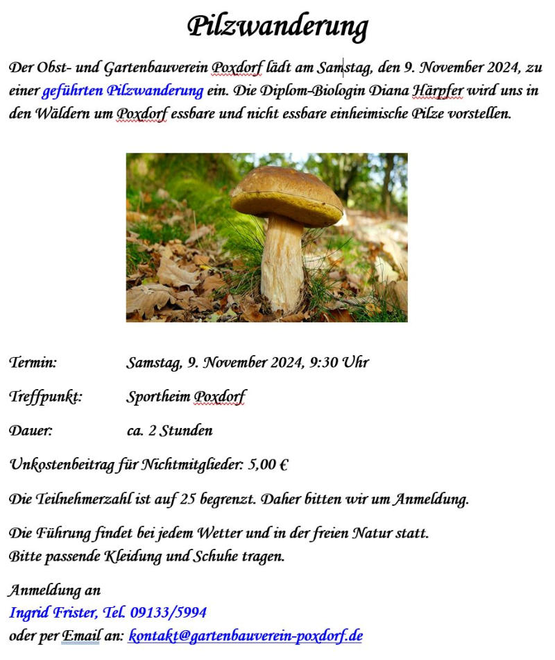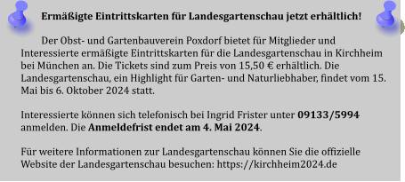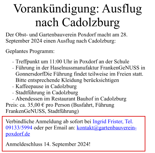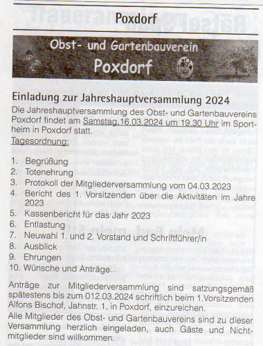 2024-05_Mai.pdf Sonntag, 30. Juni 2024  Tag der offenen Gartentür 2024  Wir weisen auf eine Veranstaltung des Kreisverbandes hin: 5 Gärten im Landkreis Forchheim  (Effeltrich, Hausen, Forchheim, Morschreuth und Etlaswind) können besichtigt werden   Uhrzeit: 11:00 - 17:00 Uhr  Details und pdf-Broschüre hier auf der Seite des Kreisverbandes… 2024-06_Juni.pdf 2024-07_Juli.pdf 2024-08_August.pdf Samstag, 28. September 2024  Vereinsausflug nach Cadolzburg     Anmeldung erforderlich, siehe Termine 2024-09_September.pdf Der praktische Gartenkalender 2025 jetzt erhältlich!  Der Obst- und Gartenbauverein Poxdorf bietet für Mitglieder und Interessierte die Möglichkeit, den praktischen Gartenkalender für das Jahr 2025 vorzubestellen, zu einem Preis von 5,50 Euro. Der Kalender führt durch das ganze Gartenjahr, wieder gut gefüllt mit Schönem, Informativem und Nützlichem. Das Kalendarium enthält Namenstage, Ferientermine in Bayern, die Zeiten von Sonnenauf- und Sonnenuntergang, die Mondphasen und den 100-jährigen Kalender. Außerdem erfahren Sie, dass „Superfood“ aus Ihrem eigenen Garten kommen kann! Interessierte können sich telefonisch bei Ingrid Frister unter 09133/5994 melden, oder senden Sie eine E-Mail an: kontakt@gartenbauverein-poxdorf.de. Die Anmeldefrist endet am 30. November 2024. 2024-11_November_2024.neu.pdf